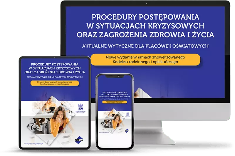 Pakiet wzorcowych procedur na wypadek kilkudziesięciu sytuacji kryzysowych oraz sytuacji zagrażających życiu i zdrowiu w placówce z załącznikami w postaci list kontrolnych, dokumentów, notatek służbowych.